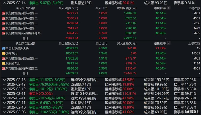 2月14日龙虎榜数据显示,机构和游资席位几乎全部出现在卖出榜单,而买入榜单则被散户席位占据。这表明,在游资和机构纷纷获利了结的同时,散户成为了接盘的主力军。