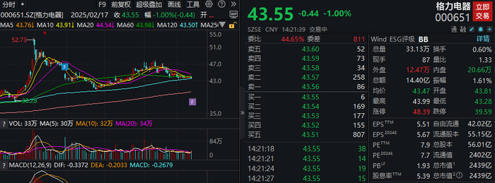 截至今天14:21,格力电器股价为43.55元,较前一交易日下跌0.44元,跌幅为1.00%。