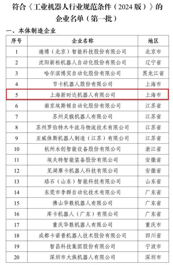 而且,新时达机器人也是首批入选符合工信部《工业机器人行业规范条件(2024版)》的本体制造企业之一。入选该名单的企业需要具备强大的技术研发能力、完善的生产体系、可靠的产品质量及良好的市场与服务表现,符合行业高标准要求。这表明,新时达机器人凭借卓越的技术实力和综合竞争力,从众多本体制造商中脱颖而出。