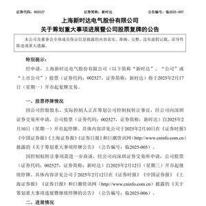 而在此前的2月9日,新时达发布了关于筹划重大事项停牌公告,宣布公司控股股东、实际控制人正在筹划公司控制权转让事宜,且公司股票自2月10日开市起停牌。