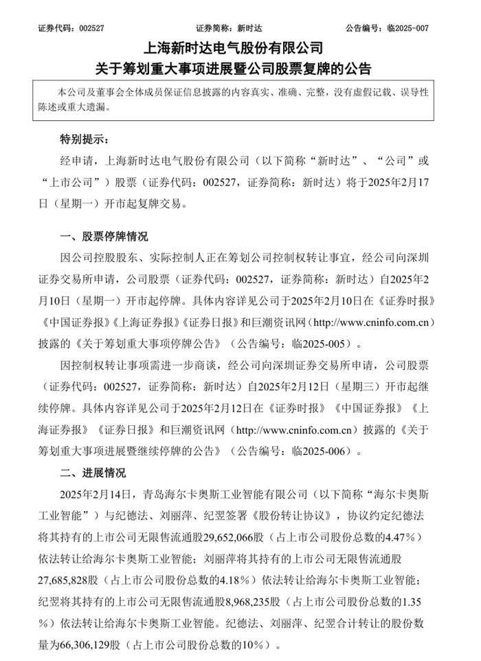 2月16日,上海新时达电气股份有限公司(以下简称“新时达”)发布公告称,青岛海尔卡奥斯工业智能有限公司(以下简称“海尔卡奥斯工业智能”)与新时达原控股股东、实际控制人——新时达创始人纪德法、刘丽萍夫妇及其女儿纪翌(2016年5月起担任新时达董事长)签署《股份转让协议》及《表决权委托协议》,海尔卡奥斯工业智能将成为上市公司控股股东,海尔集团公司将成为上市公司实际控制人;新时达股票自2025年2月17日开市起复牌交易。同日,海尔集团于其官方微信公众号也发文确认了这一消息。