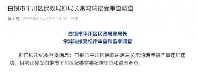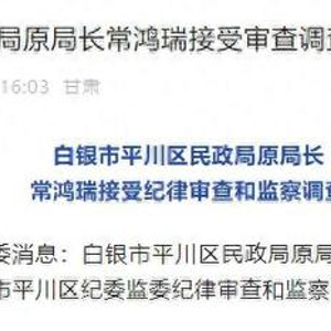 据白银市纪委监委消息:白银市平川区民政局原局长常鸿瑞涉嫌严重违纪违法,目前正接受白银市平川区纪委监委纪律审查和监察调查。