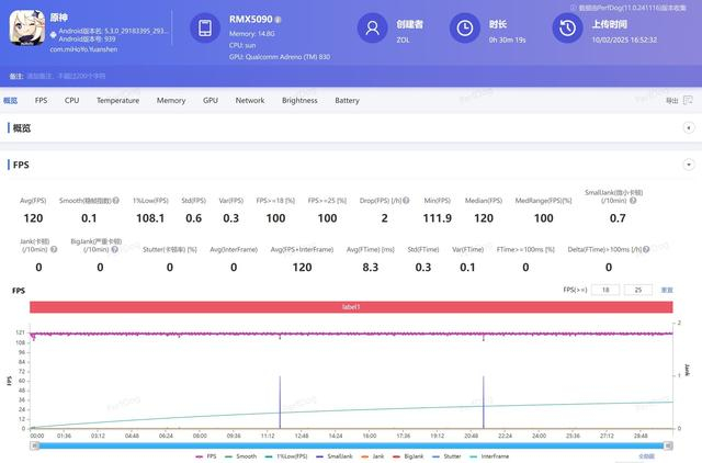 游戏表现上,真我GT7 Pro竞速版和一加 Ace 5 Pro基本一致,可以在最高画质下满帧运行《原神》,并且同样支持120帧模式的《原神》体验。