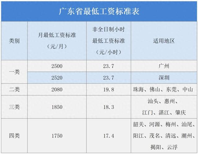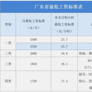 根据《通知》,此次调整仍保持四类标准,其中广州、深圳执行一类标准,广州市调整为2500元/月,深圳市调整为2520元/月,两市对应的非全日制小时最低工资标准均为23.7元/小时;二类标准调整为2080元/月,执行地区为珠海、佛山、东莞、中山,对应的非全日制小时最低工资标准为19.8元/小时;三类标准调整为1850元/月,执行地区为汕头、惠州、江门、湛江、肇庆,对应的非全日制小时最低工资标准为18.3元/小时;四类标准调整为1750元/月,执行地区为韶关、河源、梅州等10个市,对应的非全日制小时最低工资标准为17.4元/小时。