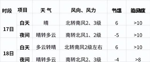 预计,17日至18日北京地区天气以晴为主,风力不大,能见度好;气温变化不大,白天最高气温6℃,夜间最低气温-5~-4℃。具体天气预报见附表。