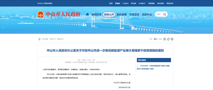 为进一步增强企业发展信心,加快构建新能源产业集群,推动我市新能源产业高质量发展,我市于2025年2月12日印发《中山市进一步推动新能源产业做大做强的若干政策措施》,提出了涵盖产业培育、技术创新、示范应用等三个方面共10条措施。