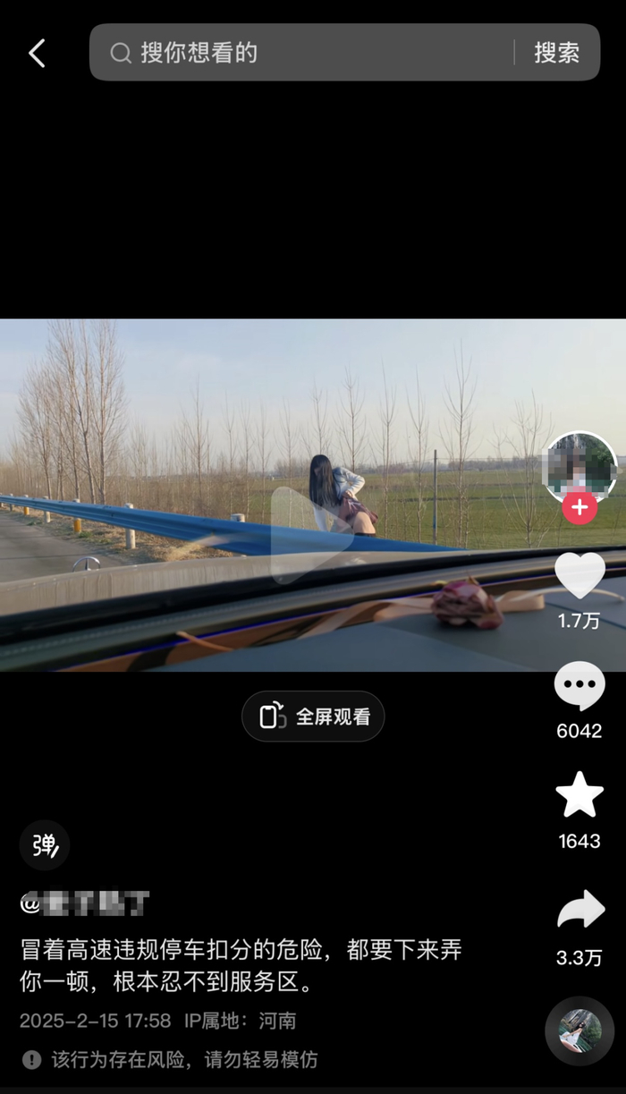 视频发布者称,因为孩子要跳车,“冒着违停驾驶证记分的危险,根本忍不到服务区。”