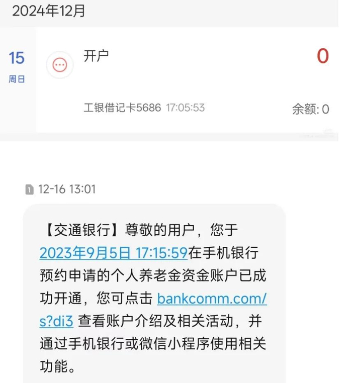 2023年9月5日,交行工作人员到其公司统一办理工资卡,最近收到交行短信称2023年9月5日申请的个人养老金账户成功开通了,但当时根本没提个人养老金账户的事。
