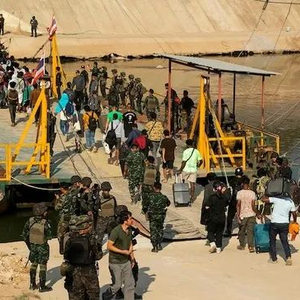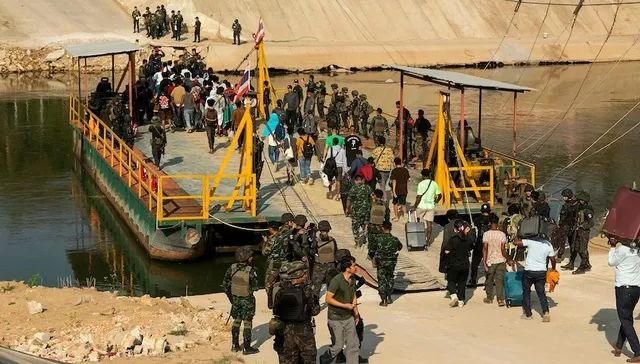 当地时间2025年2月12日,缅甸克伦邦妙瓦底,电诈园受害者们登上船只,穿越河流,等待泰国军队士兵接应,准备被遣返回国。来源:视觉中国