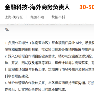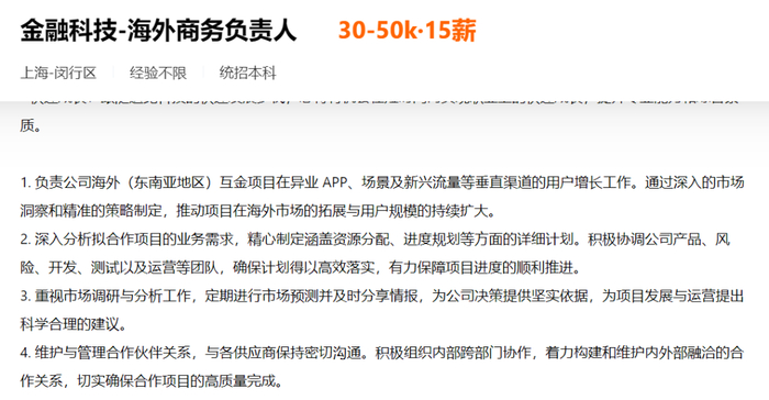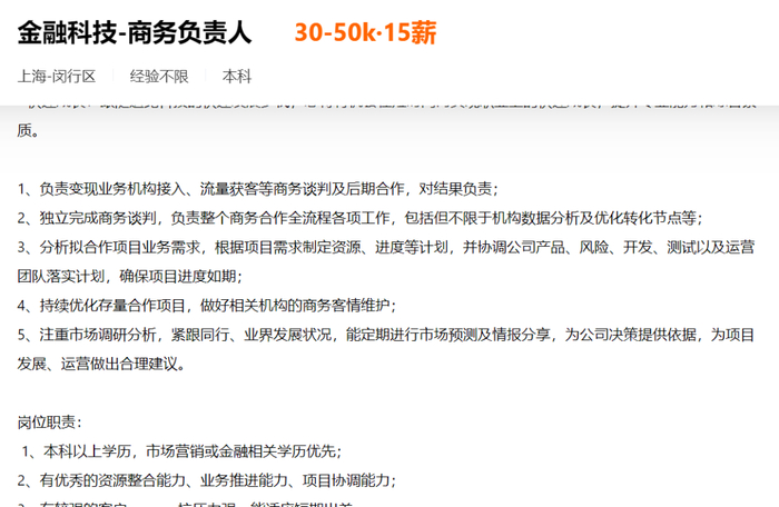 比如,在招聘网站上,追觅正在招聘“金融科技-商务负责人”,月薪在30-50K之间,其岗位职责主要包括“负责变现业务机构接入、流量获客等商务谈判及后期合作,对结果负责”等。