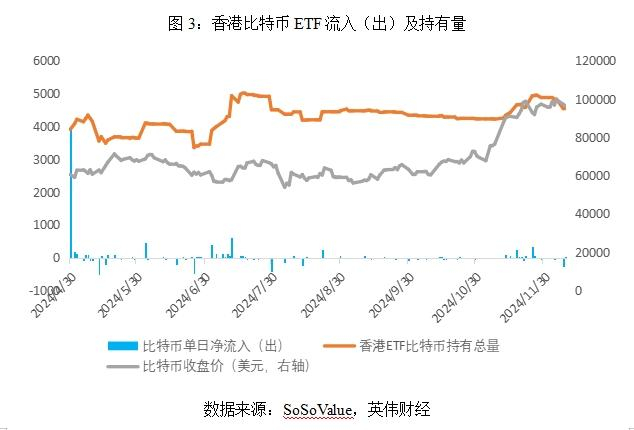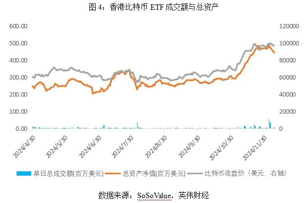 比特币申购额反映的是一级市场的变化,主要由大额持币人和机构投资者组成。而图三的成交额则代表的是二级市场的交易情况,由于比特币价格的上升以及整体持币数量的增加,比特币ETF资产净值已从首日的2.47亿美元上升到4.4亿美元(截至12月10日)。类似的,ETF总资产走势和比特币价格有显著正向关系。值得注意的是,8月至11月特朗普当选美国总统之前,比特币的价格处于震荡区间时,对应ETF的每日成交额较小,8月1日至10月底三个月的成交额均值约为二百五十万美元,而11月1日至今的成交额均值达到一千一百万美元,是前者的四倍多,可见在“特朗普交易”的驱动下,香港ETF市场的活跃度得到了显著提升。