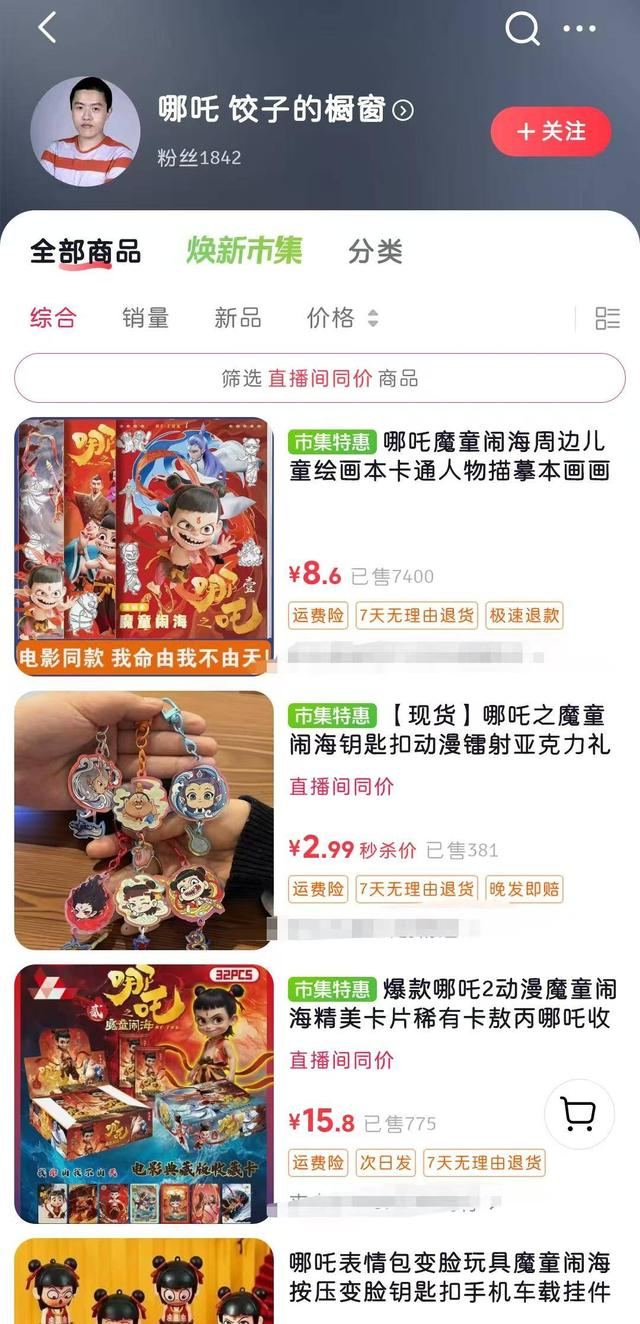 这一大堆“饺子”在昵称上也玩出了花,有的加上了饺子的emoji图标,还有的不是“饺子”是“饺孑”,此外也有使用导演饺子本名杨宇的,昵称变成“杨宇导演”并使用导演饺子本人的照片作头像,虽然大多数账号的粉丝量很少,但是其中不乏有上万甚至上十万粉丝的账号,虽然让一些网友感到迷惑,但是大多账号是在“玩梗”,简介中说明自己不是导演饺子或者说饺子没有这个平台的账号。但恐怕有人已经拿着山寨饺子起号打起了歪主意,有少数“饺子”账号开通了橱窗,售卖《哪吒2》电影周边商品,也有一些“饺子”账号在发布了点赞量、评论数比较高的视频后悄悄的删除了头像和昵称,评论区中依然可见一些网友对账号真实性的质疑。