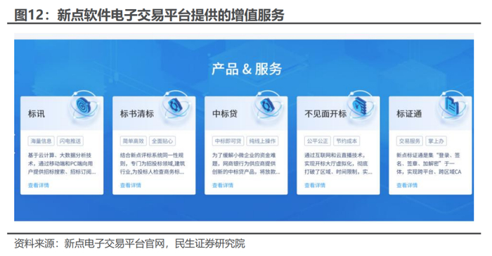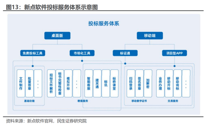 新点软件承建G端采招平台,同时自建自营平台提供采招服务。公司是G端采招平台的龙头企业,截至2023年底,公司累计承建公共资源交易平台项目覆盖29个省(自治区、直辖市),服务超过200多个地市、1,000多个县市区。在自营平台方面,公司积极推动交易市场化,在多个省市县持续推进交易平台市场化工作,为项目规模在限额以下的招标人提供市场化交易平台。公司打造的SaaS化平台——“新点电子交易平台”新增85个专区;2023年平台交易标段数量同比增长41%。