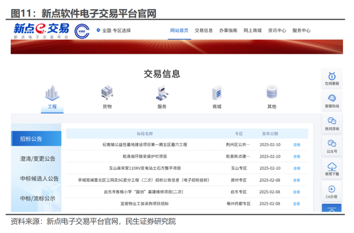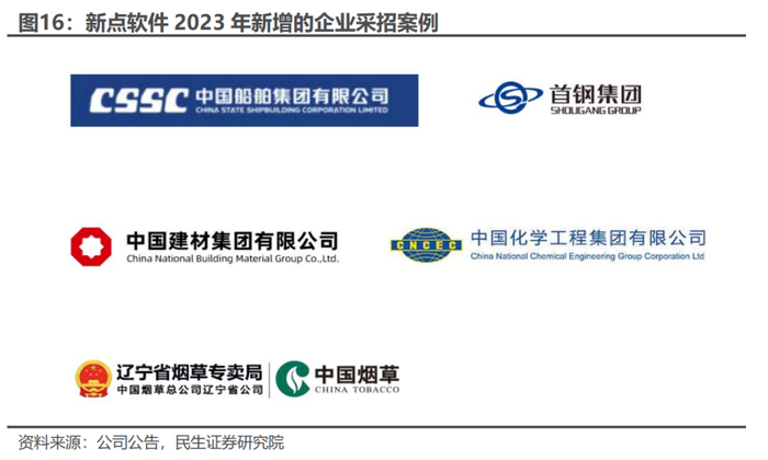 企业采购已具备多个标杆案例,企业采购有较强的降本增效诉求。企业招采以央企、国企数字化转型为抓手,为企业供应链数字化改革做好支撑。基于新点企业智慧采购平台8.0,借助公司低代码平台,以可视化、模型驱动设计以及预构建组件等方式,快速地创建应用程序,显著提升开发效率,缩短项目上线和更新周期。公司2023年新增中国船舶、中国建材、中国化学、安徽能源、首都钢铁、辽宁烟草等标杆案例,累计承接大型央企、国企的电子招标采购平台60余个。对于大型央国企而言,通过AI赋能的电子化交易平台,有望大幅提升企业整体的采购效率,为企业带来显著的降本增效成果,直击客户痛点。
