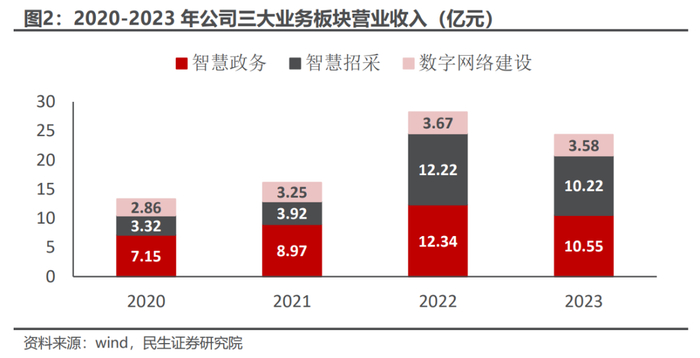 招采、政务板块齐头并进。从公司收入结构看,智慧政务、智慧招采两大板块是收入的主要来源,2023年收入占比分别为43%、42%。智慧政务聚焦数字政府核心业务,持续加大对一网通办、一网统管、一网协同产品的智能化研发和数据服务化转型,同时开展数据要素运营的相关探索;智慧招采领域,公司面向政府端、企业端均持续探索,并通过招采运营实现商业模式的升级。