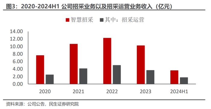 招采领域拥有突出优势,Saas模式空间广阔。招采业务一直以来是公司的基石业务,其中招采运营以Saas模式为客户提供服务,具备良好的商业模式。2023年整体宏观环境有所波动,公共招投标受到一定影响,导致招采业务有所下滑。截至2024H1,公司的招采运营业务营收1.72亿元,同比逆势增长8.6%,展现出一定的韧性。