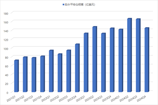 段永平管理的H&H International Investment规模同样有所下降,截至2024年末的规模为145.16亿美元,约合1055亿元人民币,较上季度末下降12.2%。