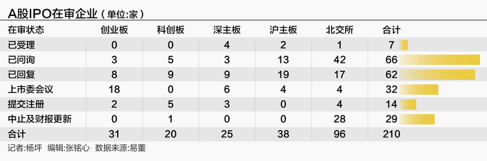 审核状态上,绝大部分的排队企业处在问询阶段。据记者梳理,210家IPO排队企业中,受理状态7家,问询(含已问询及回复)状态128家,上市委会议通过32家,中止审查29家,提交注册14家。