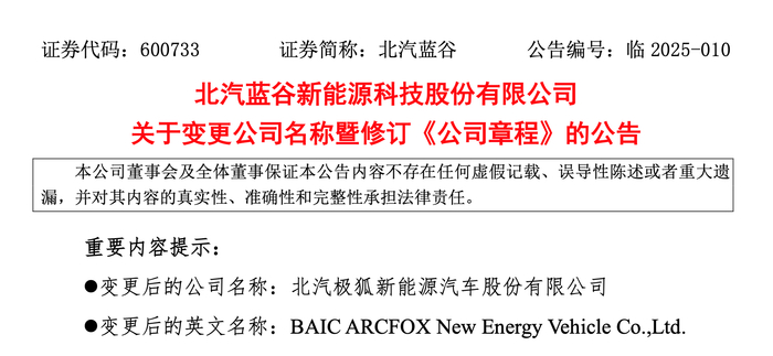 日前,北汽蓝谷(600733.SH)发布公告称,公司拟将中文名称由“北汽蓝谷新能源科技股份有限公司”变更为“北汽极狐新能源汽车股份有限公司”。