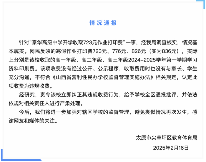 2月16日晚,山西省太原市尖草坪区教育体育局再通报此事,称针对“泰华高级中学开学收取723元作业打印费”一事,经该局调查核实,情况基本属实。