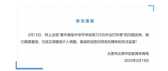 近日,网上出现“泰华高级中学开学收取723元作业打印费”的问题反映,2月14日,太原市尖草坪区教育体育局发布情况通报称,已成立调查组介入调查。