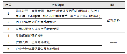 企业在补开、换开发票、其他外部凭证过程中,因对方注销、撤销、依法被吊销营业执照、被税务机关认定为非正常户等特殊原因无法补开、换开发票、其他外部凭证的,可凭以下资料证实支出真实性后,相应支出可以或追补至该支出发生年度税前扣除(追补年限不得超过五年)。