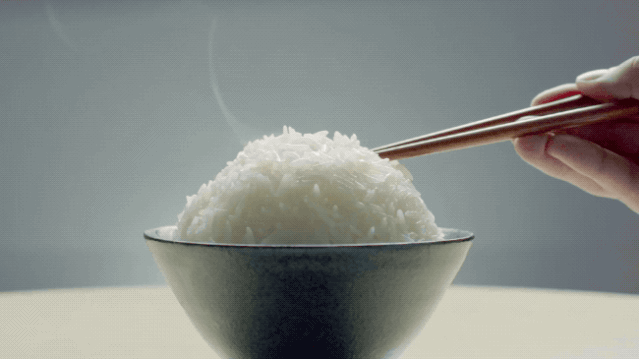 用河韵乡五常稻花香煮出来米饭柔软蓬松,盛在碗里,还可看见饭粒在轻微跳动。