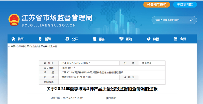 江苏省市场监管局发布关于2024年夏季被等3种产品质量省级监督抽查情况通报