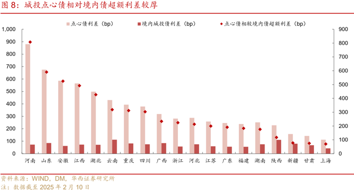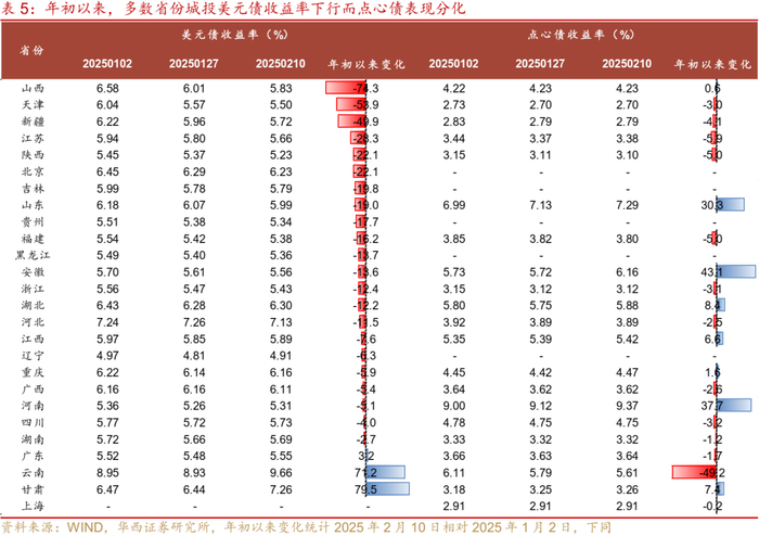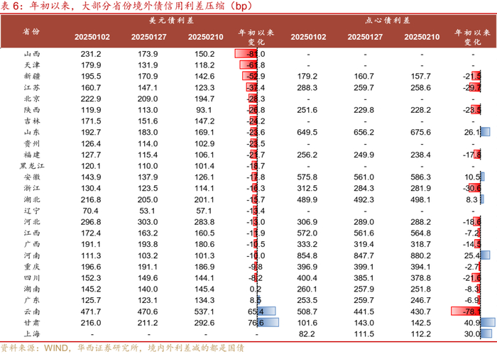与此同时,大部分省份境外债信用利差压缩。2025开年以来美债收益率维持震荡,10年期和1年期美债收益率分别下行7bp和上行8bp,波动不大,而山西、天津、新疆、江苏、北京、陕西等多个省份美元债信用利差压缩超过20bp,点心债也类似,云南、浙江、江苏、陕西、四川、新疆等多个省份也压缩超过20bp。