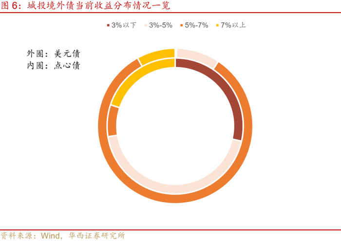 具体来看,城投境外债约三分之二的收益率都在5%以上,其中点心债约800亿元,占其余额的27.5%,美元债约4500亿元,占其余额的九成。而从7%以上更高收益的情况来看,点心债余额更大,达到582亿元,美元债为400亿元。