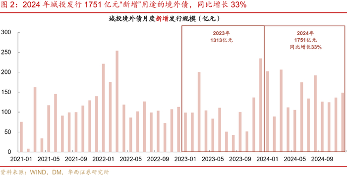 2024年,境外债总发行规模高达3728亿元,同比大幅增长70%。拆分“新增”用途,2024年城投境外新增规模1751亿元,同比增长33%。与境内净融资体量相比,境外新增债约是境内的114%。
