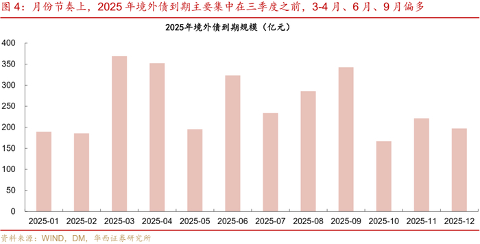 2025年境外债进入到期大年。规模上,2025年境外债到期3063亿元人民币,较2024年增长42%。若境内债置换境外债仍偏慢,同时2025年新增债持平去年(1700亿元+),则2025年境外债发行规模或突破4500亿元。节奏上,到期集中三季度之前,3-4月、6月、9月偏多。