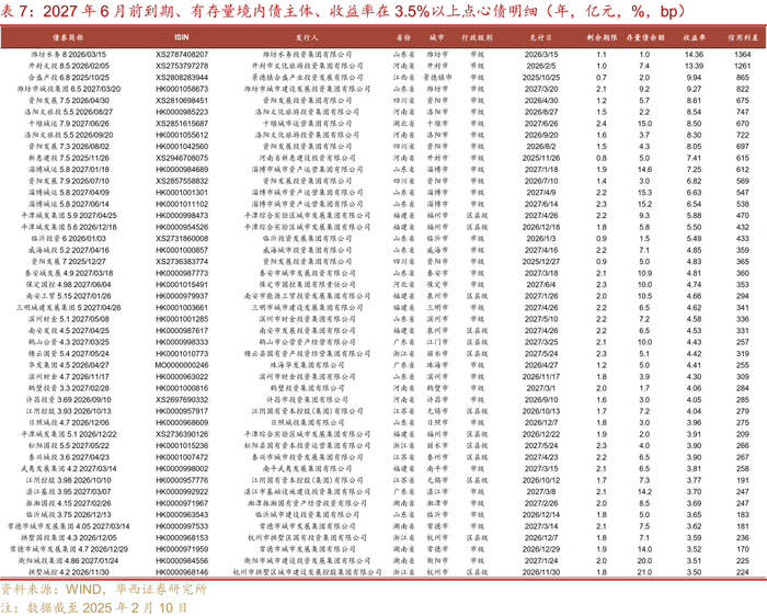 并且在较厚的利差下,点心债投资不用过度下沉就能获得可观的收益,像广东、江苏、浙江、福建等沿海经济发达省份当前信用利差都有250bp以上。江苏、浙江的区县平台,不少2年内点心债收益率还在3.5%以上。此外,还可以关注一些收益率较高的市级平台2年内的点心债。我们整理出2027年6月前到期、有存量境内城投债并且收益率在3.5%以上的城投点心债明细,供投资者参考。