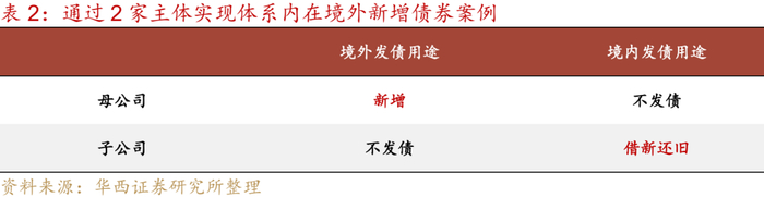 除单一主体直接在境外新增、境内借新还旧之外,境外发债突破还可能以母子公司形式实现,即通过2家主体实现体系内的新增。具体形式为,主体在境内仅能借新还旧,通过另一主体在境外新增发债,通常以上设母公司的形式,如下表所示。
