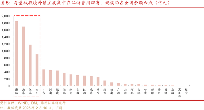 截至2025年2月10日,城投债境外债存量规模约9565亿元人民币,区域分布相对集中,主要在浙江、山东、江苏和四川,占全国余额约六成左右,其中浙江、山东和江苏规模超过千亿元。从收益率来看,点心债平均为4.93%,而美元债更高,达到5.77%,不过点心债7%以上高收益的余额更多。