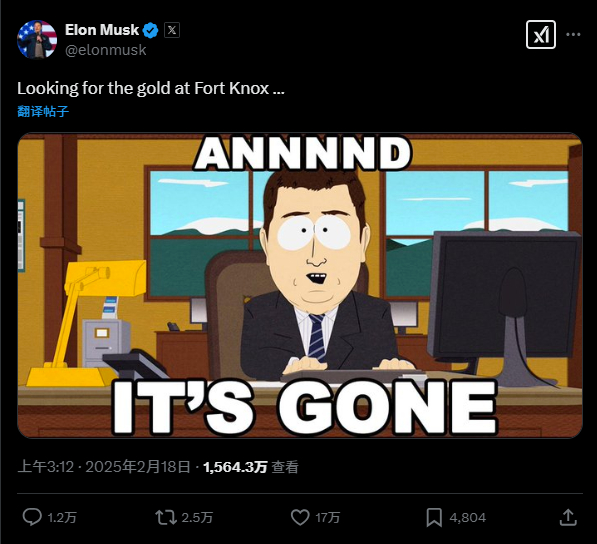 据悉,整件事的开端是知名财经博客Zerohedge上周末在X上@马斯克称:“如果马斯克能去诺克斯堡看看,确保4580吨美国黄金(储备)真的在那里,那就太好了。上次去库房核实还是在50年前的1974年。”
