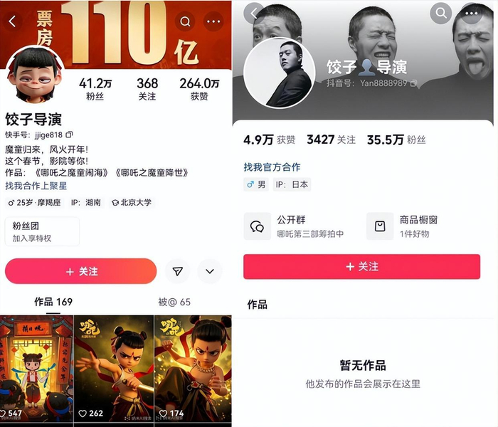然而,两大短视频平台发现数十个疑似假冒他的账号,粉丝量几百到数十万不等,以“饺子”相关命名 ,用哪吒或杨宇照片当头像,发布饺子及哪吒相关内容。账号简介花样百出,有些自称是饺子导演小号,还挂着商品链接,吸引网友留言互动。