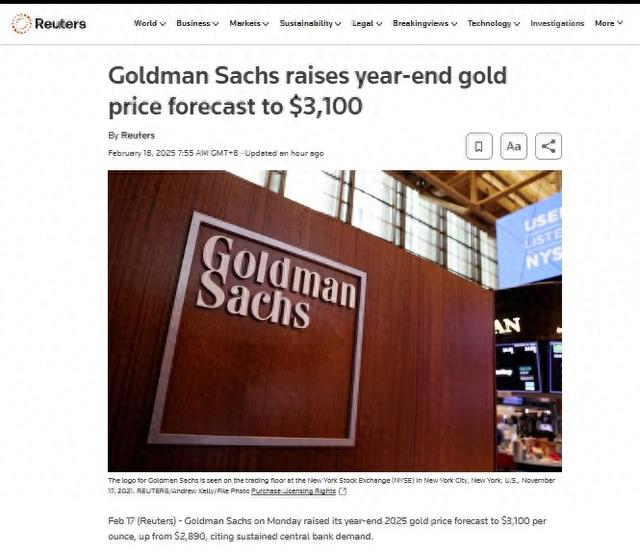 【环球网财经综合报道】据路透社报道,国际知名投行高盛发布报告称,将2025年底的黄金目标价从2890美元/盎司上调至3100美元/盎司。