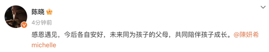 2月18日,陈晓和陈妍希在社交平台发文官宣离婚。两人发布同样的文字内容:“感恩遇见,今后各自安好,未来同为孩子的父母,共同陪伴孩子成长。”并@出对方。