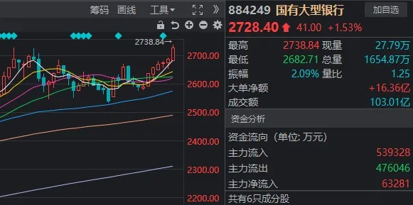 同花顺数据显示,“国有大型银行”指数今天创下历史新高,上一个高点发生在去年12月25日。今天之前,该指数已走出6连阳。
