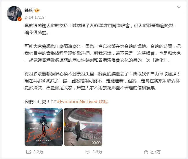谢霆锋早前宣布将举行《Evolution Nic Live谢霆锋进化演唱会》,并发布以香港启德体育园为背景的演唱会海报。不少歌迷激动留言,“等足25年终于等到!”“有生之年终于等到你!”