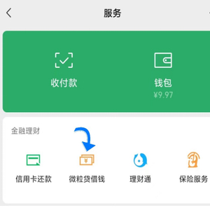 方式一:打开微信,点击“我”,然后选择“服务”,找到“微粒贷借钱”。