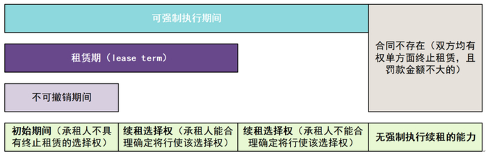 企业确定租赁期时不仅应考虑不可撤销的租赁期间,如果承租人合理确定将行使续租选择权或不行使终止租赁选择权,租赁期应包含不可撤销租赁期间、续租选择权涵盖期间和终止租赁选择权涵盖期间。包含购买选择权的租赁即使租赁期不超过12个月,也不属于短期租赁。
