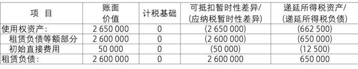 分析:本例中,在租赁期开始日,甲公司租赁负债的账面价值为 2 600 000元,计税基础(即账面价值减去未来期间计算应纳税所得额时按照税法规定可予抵扣的金额)为0,产生可抵扣暂时性差异 2 600 000元;甲公司使用权资产的账面价值为 2 650 000元(2 600 000+50 000),其中按照与租赁负债等额确认的使用权资产部分(2 600 000元)的计税基础(即收回资产账面价值过程中计算应纳税所得额时按照税法规定可以自应税经济利益中抵扣的金额)为0,产生应纳税暂时性差异 2 600 000元。