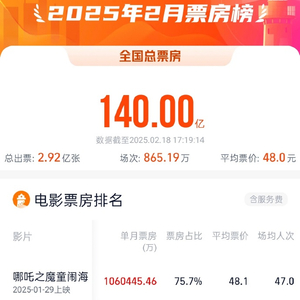 2025年2月电影票房破140亿 界面新闻 界面新闻官方账号 2025.02.1817:23 关注 据灯塔专业版,截至2月18日,2025年2月总票房(含预售)突破140亿!《哪吒之魔童闹海》贡献当月票房75.7%。