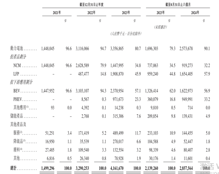 BEV电池产品为正力新能最主要的收入来源,各期业务收入占比总收入的96.6%、94.3%、57.1%及56.9%。