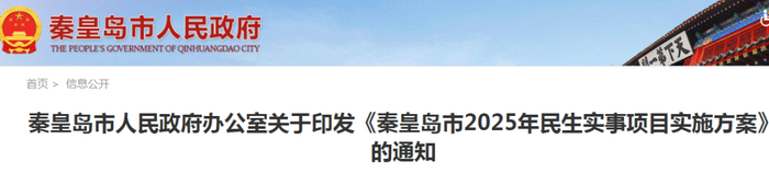 日前,秦皇岛市人民政府办公室印发关于《秦皇岛市2025年民生实事项目实施方案》的通知。