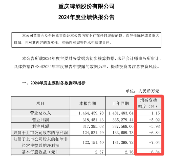 近日,重庆啤酒(600132.SH)发布了2024年业绩快报,预计2024年营收146.4亿元,同比下滑1.15%;预计净利润为12.5亿元,同比下滑6.84%。据此推算2024年第四季度公司营收15.8亿元,同比降幅超10%。