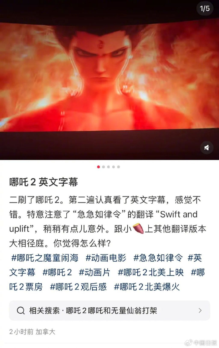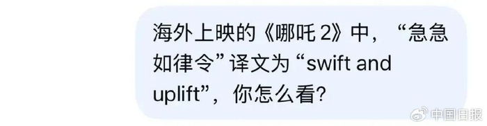 据中青报报道,不少网友在观影后指出,在海外上映的《哪吒之魔童闹海》采用中文配音+英文字幕,其中“急急如律令”译文为“swift and uplift”。这一消息也得到了一家媒体驻外记者的证实。