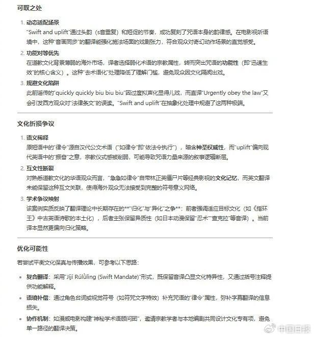 对此,DeepSeek提到,原句“急急如律令”是道教咒语,兼具命令性与神秘感,要求短促有力。译文的“Swift and uplift”通过押韵强化了节奏感,同时以简洁的短语传递了“迅速”和“提升能量”的意象,符合施法场景的动态感。